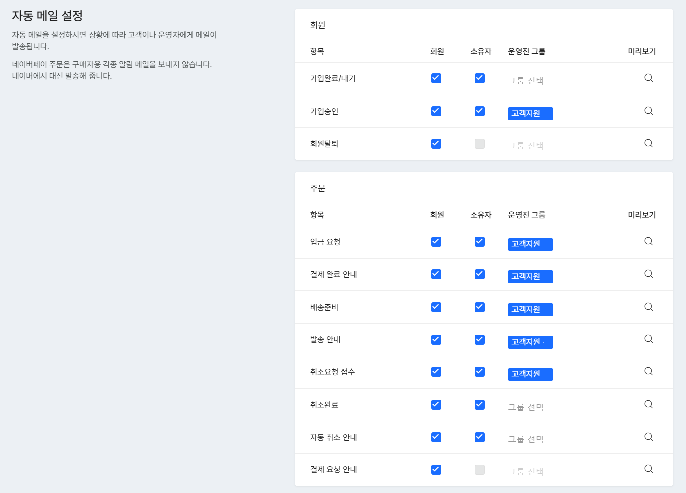 예를 들어, 신규 주문이 일어났을 때 메일 알림을 받으려면 주문 항목에서 입금 요청과 결제 완료 안내에 소유자를 각각 선택하면 됩니다.