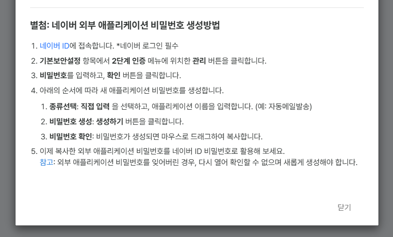 네이버 계정에서 2단계 인증을 사용하고 계시다면 비밀번호를 따로 생성하여 입력해 주셔야 해요.